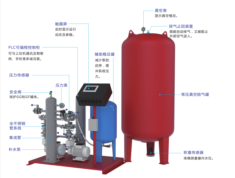 控制單元由集成控制柜、壓力傳感器、液位傳感器、水泵、電磁閥等組成??筛鶕?jù)用戶需求增加真空脫氣單元(選配)。