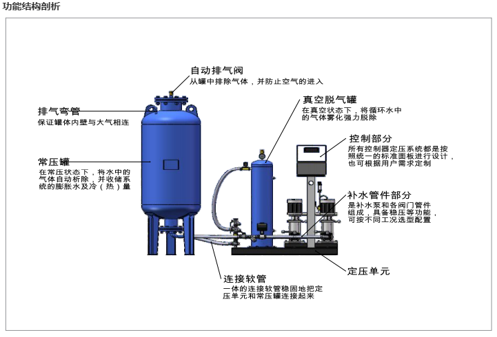 1、自動定壓,自動補水,自動泄水,自動脫除系統(tǒng)內(nèi)游離氣體,溶解氣體。