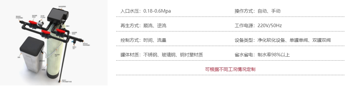 水的硬度主要由鈣、鎂形成及表示,一般采用陽離子交換樹脂(軟水器)將原水通過鈉型陽離子交換樹脂,使水中的硬度成分Ca2+、Mg2+與樹脂中的Na+相交換,從而吸附水中的Ca2+、Mg2+,使水得到軟化。隨著樹脂內(nèi)Ca2+、Mg2+的增加,樹脂去除Ca2+、Mg2+的效能逐漸降低,當(dāng)樹脂吸收一定量的鈣鎂離子之后,就必須進(jìn)行再生,再生過程就是用鹽箱中的食鹽水沖洗樹脂層,把樹脂上的硬度離子在置換出來,隨再生廢液排出罐外,樹脂就又恢復(fù)了軟化交換功能。